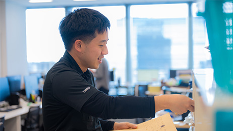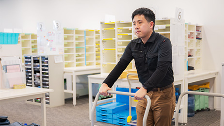 高校3年生のときに学校の紹介でインターン実習に参加したことが入社のきっかけです。そして、入社後は2020年まで事務の仕事をしていました。ある時、ジョブサポーターから「物流部に行ってみないか」と誘われて、不安もありましたが挑戦することに決めました。物流部へは、まず2週間のトライアルを経て正式に異動となりました。現在は社内の10フロアに分かれた各部署に届いた郵便物などをデリバリーしたり、発送物を回収したりする業務を担当しています。